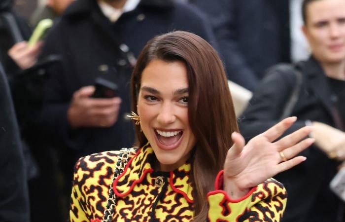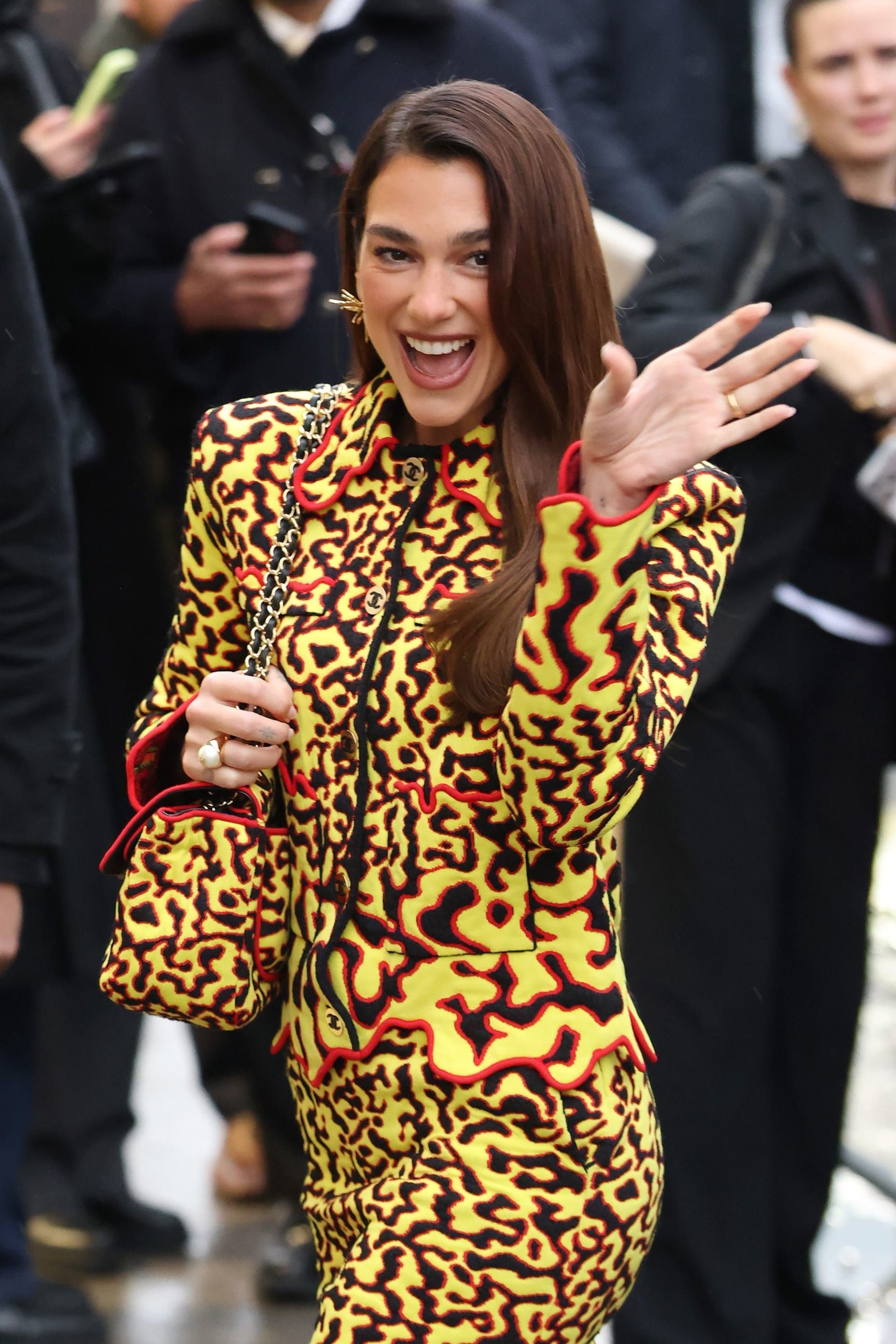 وفي عرض دار "شانيل" الفرنسيّة، سرقت ضيفة الشرف المغنيّة البريطانيّة دوا ليبا الأنظار بإطلالة لافتة بدت فيها وكأنها تستحضر شخصية "فران فاين"، من خلال بدلة تنورة جريئة التصميم وحقيبة 2.55 الكلاسيكية. غطّت الإطلالة بالكامل تموّجات آسرة بالأصفر والأسود والأحمر، أقرب إلى نقشة حيوانية ممزوجة بلمسة حمضية جريئة.