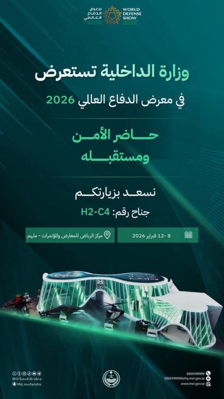 تشارك وزارة الداخلية في معرض الدفاع العالمي 2026م، الذي يقام تحت رعاية خادم الحرمين الشريفين الملك سلمان بن عبدالعزيز آل سعود -حفظه الله- بمدينة الرياض، خلال الفترة من 8 حتى 12 فبراير الجاري، تحت شعار “مستقبل التكامل الدفاعي”.