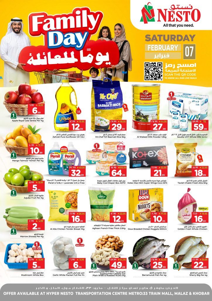 و بتقدم كمان تخفيضات نستو الدمام في يوم العائلة منتجات العناية بالأطفال مثل الحفاضات ومنتجات العناية النسائية إضافة إلى الدقيق واللحوم المجمدة مثل صدور الدجاج وناجتس الدجاج والدجاج الكاملو