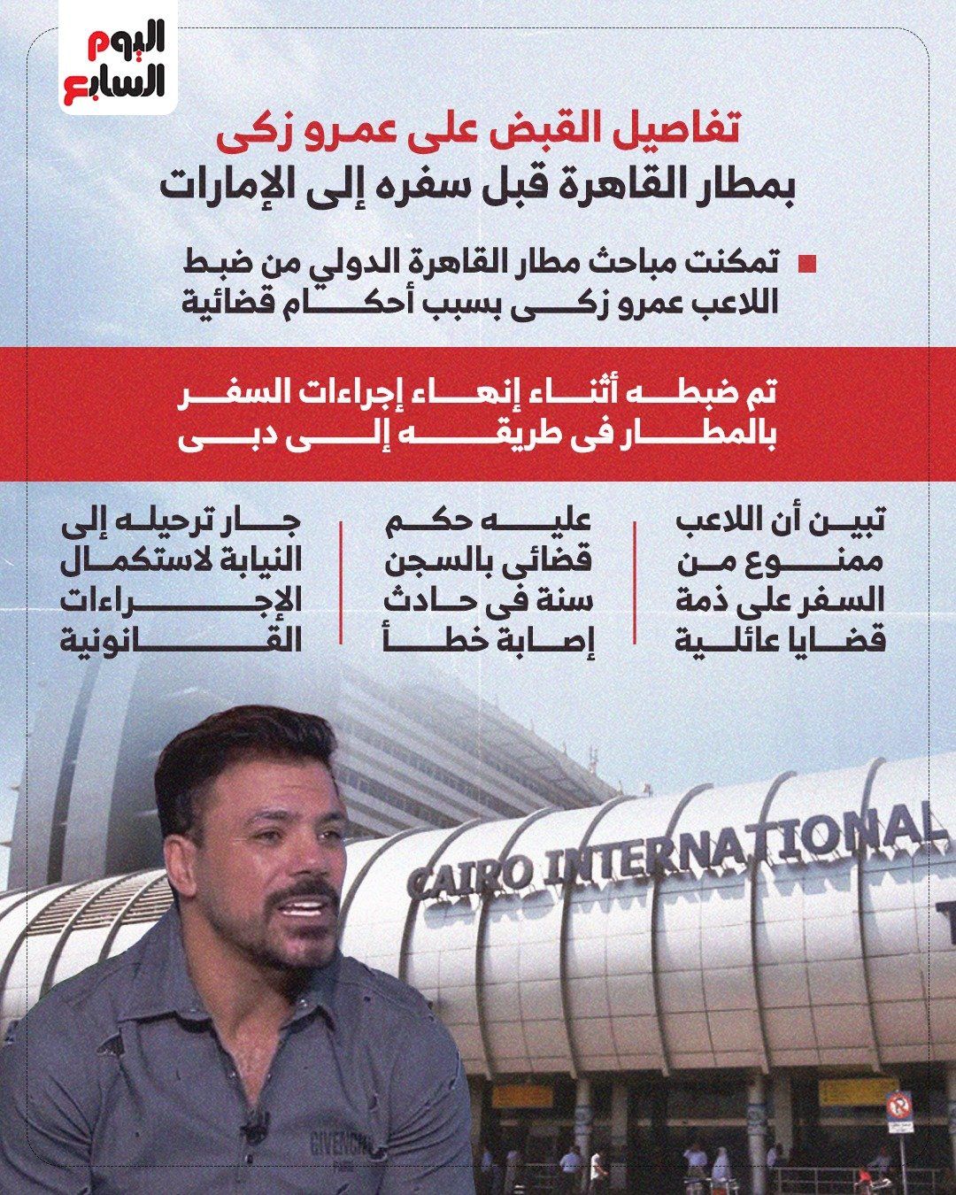 وأكدت مصادر مطلعة في تصريحات خاصة لـ"اليوم السابع" أنه أثناء إنهاء إجراءات سفر لاعب كرة القدم السابق يدعي " عمرو ح . ز. م" مواليد محافظة الدقهلية والشهير بـ"عمرو زكي"، "البلدوزر" علي متن طائرة الخطوط الاماراتية في طريقة إلى دبي.