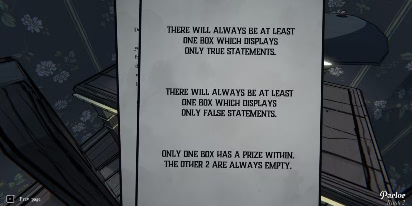 يعتمد لغز Parlor Game على وجود ثلاث صناديق مختلفة يحتوي كل صندوق منها على عبارة مكتوبة تمثل معلومة قد تكون صحيحة أو خاطئة.