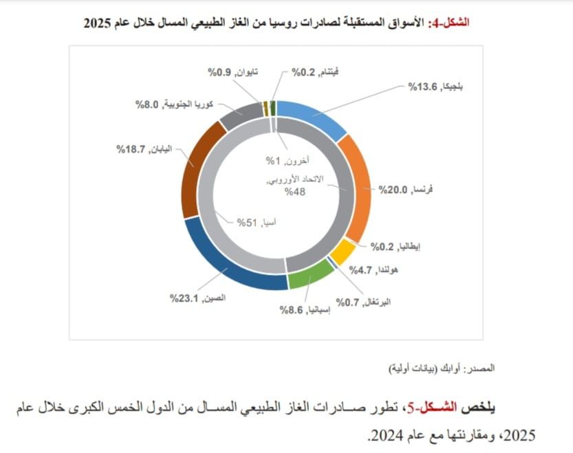أما على صعيد الوجهات المستقبلة للغاز الطبيعي المسال من روسيا خلال عام 2025، فلا تزال تعتمد روسيا على سوق الاتحاد الأوروبي (27-EU) كوجهة رئيسية لتصريف صادراتها، حيث استحوذ على نحو 48% من إجمالي ما صدرته روسيا خلال عام 2025. ويتدفق الغاز الطبيعي المسال الروسي إلى أوروبا عبر الموانئ المنتشرة في فرنسا، وبلجيكا، وإسبانيا، وهولندا. ومن ثم فإن إبرام أي حظر على واردات الغاز الطبيعي المسال سيكون له تداعيات قاسية على روسيا، لأهمية السوق الأوروبي لها كمنفذ تسويقي لما يقارب نصف إنتاجها.