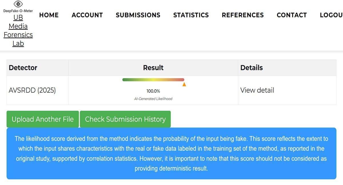 وبيّن فحص المشاهد عن طريق Deepfake-O-Meter، المدعومة من جامعة بافالو الأمريكية، أن الفيديو زائف ومُنتج بتقنيات الذكاء الاصطناعي بنسبة 100%.