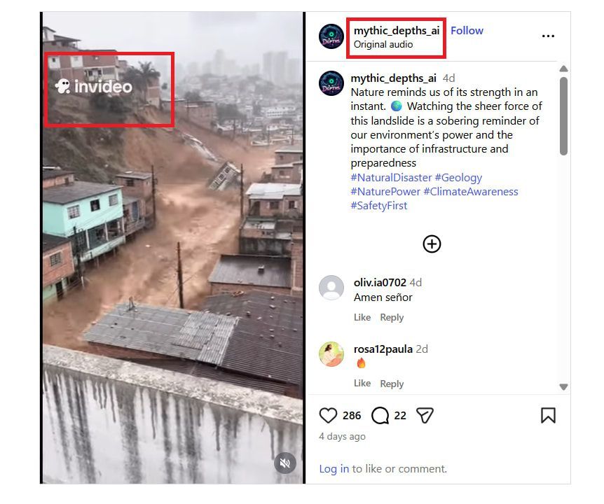 نُشرت بعض هذه اللقطات في حسابات مهتمة بالذكاء الاصطناعي عبر منصة إنستغرام، وخلالها ظهر شعار أداة "Invideo" التي تُستخدم في توليد هذه النوعية من المقاطع.