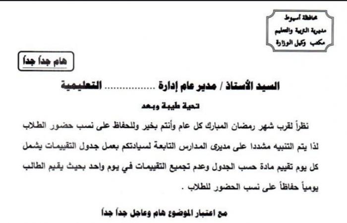 وجهت مديرية التربية والتعليم والتعليم الفني بمحافظة أسيوط، تنبيها لمديري المدارس بشأن عمل جدول التقييمات لطلاب صفوف النقل من الثالث الابتدائي حتى الثاني الثانوي خلال شهر رمضان الكريم بالتزامن مع قرب موعد حلوله.