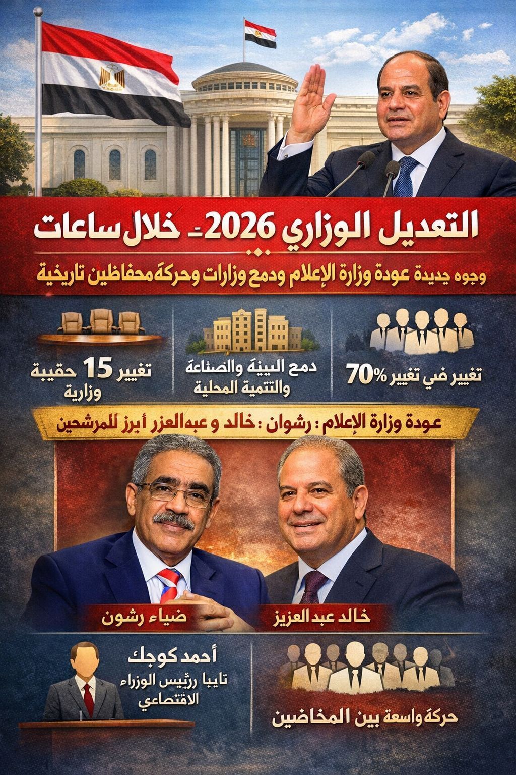 يعلن خلال ساعات التعديل الوزاري الجديد 2026 والذى وجوه جديده تدخل التشكيل الحكومى الجديد لأول مرة ووجوه ترحل، وينتظر المواطن المصري هذا التعديل الوزاري الجديد، وكشفت الساعات الأخيرة عن تعديل ما يقرب من 13 إلى 15 حقيبة وزارية من بينهم الوزارت الخدمية بنسبة 40 % تقريبا، كما سيتم دمج بعض الوزارات ومنها وزارة البيئة والصناعة والتنمية المحلية، وسيقوم الوزراء والنواب الجدد بحلف اليمين الدستورية أمام رئيس الجمهورية غدا الأربعاء، بعض الوجوه ستبقى وأخري ستغادر، لكن الثابت أن الدولة تمضى للأمام، والتعديل الوزاري ليس مجرد تبديل أسماء، بل رسالة بأن الأداء هو المعيار، والمسؤولية تكليف لا تشريف
