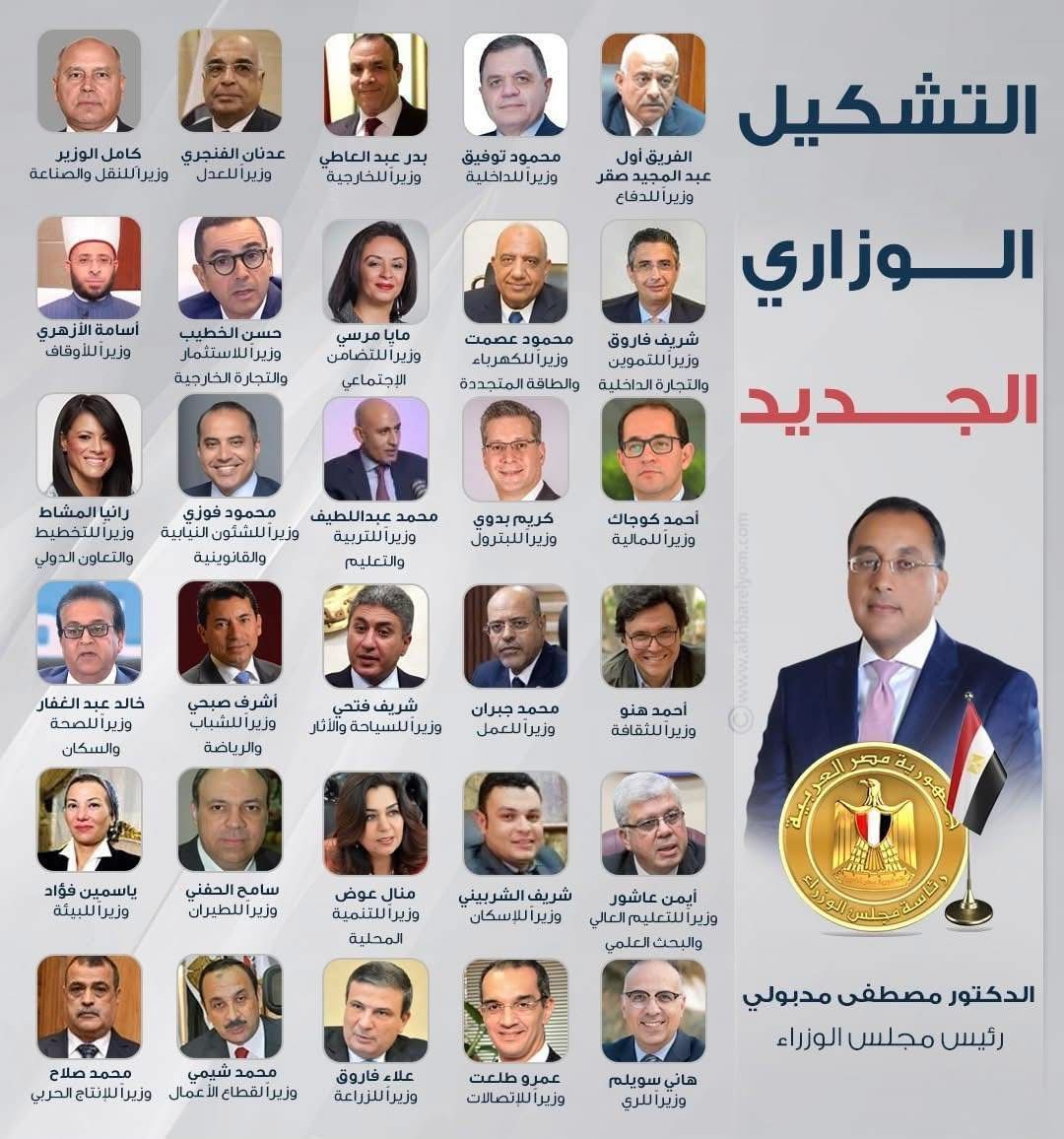 ومن بين الوزراء المتوقع مغادرتهم فى التعديل الوزاري الجديد، الدكتور شريف فاروق وزير التموين والتجارة الخارجية والدكتورة رانيا المشاط وزيرة التخطيط والتنمية الاقتصادية والتعاون الدولي وربما يتم ترشيحها لمنصب جديد، والمهندس شريف الشربينى وزير الأسكان والمرافق والمجتمعات العمرانية، والدكتور أشرف صبحى وزير الشباب والرياضة، والمهندس حسن حطب وزير الاستثمار والتجارة الخارجية، ومحمد جبران وزير العمل، وكريم بدوي وزير البترول والثروة المعدنية، والمهندس محمد الشيمي وزير قطاع الأعمال العام، والمستشار عدنان الفنجري وزير العدل، والدكتور عمرو طلعت وزير الاتصالات وتكنولوجيا المعلومات، ووزارة التنمية المحلية بالاضافة إلى وزير الزراعة