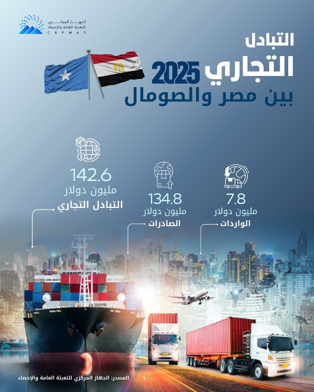وإجمالا بلغت قيمة التبادل التجارى بين مصر والصومال نحو 142.6 مليون دولار خلال عام 2025، مقابل 127.8 مليون دولار خلال عام 2024 بنسبة ارتفاع بلغت 11.6% .