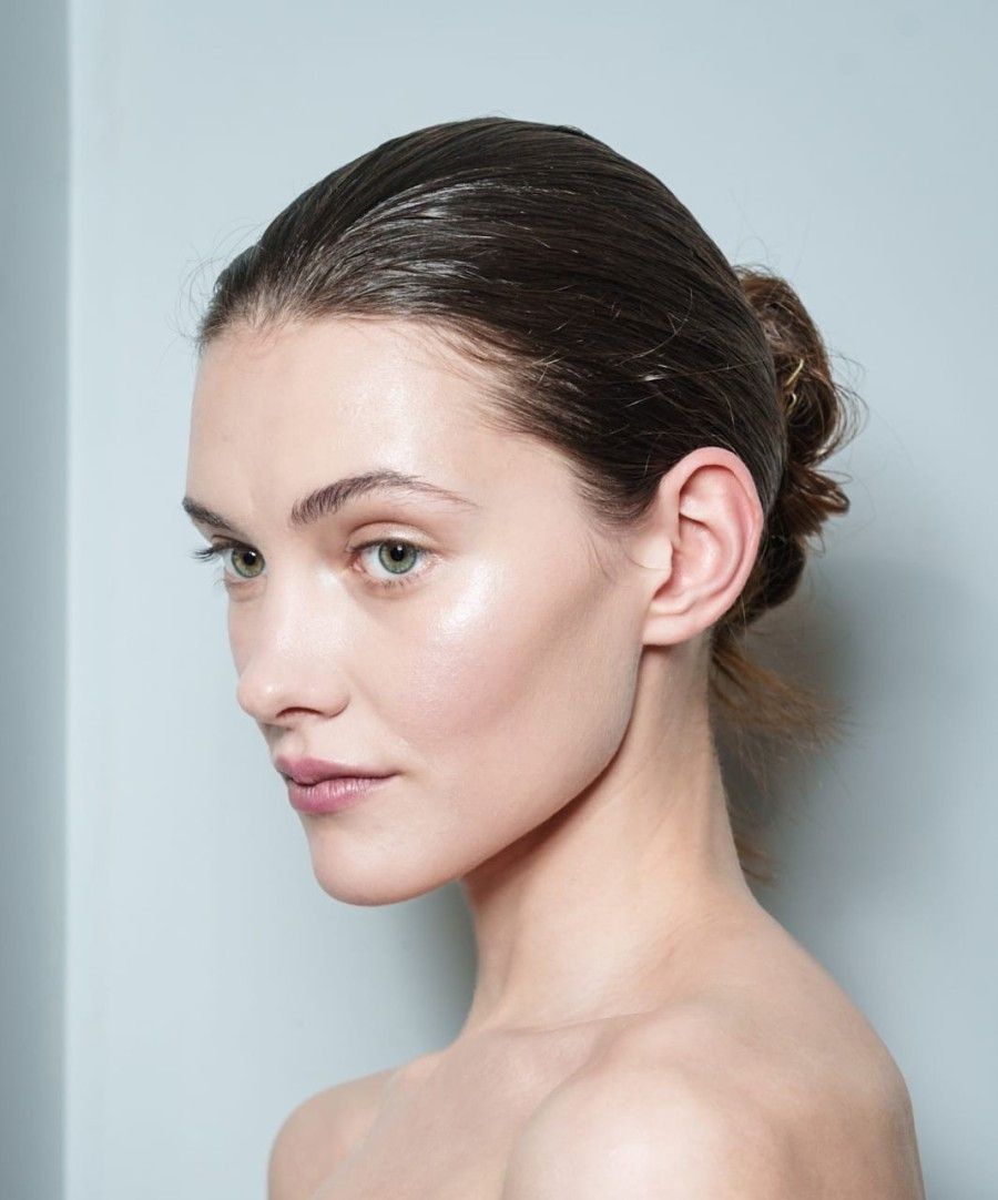 تسريحة الكعكة تعتمد على جمع الشعر بالكامل إلى الخلف بطريقة ملساء تمنح الوجه حضوراً نقياً وواضحاً. يتم تثبيت الخصل بإحكام عند أسفل الرأس لتكوين كعكة صغيرة أنيقة ومرتبة. اللمعة الخفيفة على الشعر تضيف لمسة رطبة وعصرية تناسب الإطلالات الراقية. هذه التسريحة تبرز ملامح الوجه وتعطي توازناً بين البساطة والفخامة.