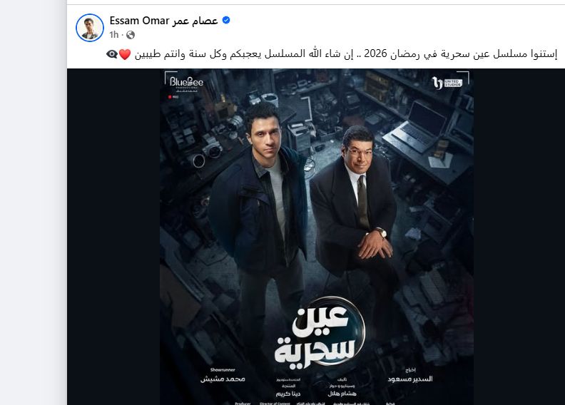 روج الفنان عصام عمر، لمسلسله المنتظر عين سحرية الذى يخوض به سباق دراما رمضان 2026، ضمن خريطة مسلسلات الشركة المتحدة للخدمات الإعلامية، إذ شارك جمهور ببوستر المسلسل، عبر حسابه الرسمي على فيس بوك، معلقاً: "إستنوا مسلسل عين سحرية في رمضان 2026 .. إن شاء الله المسلسل يعجبكم وكل سنة وأنتم طيبين".
