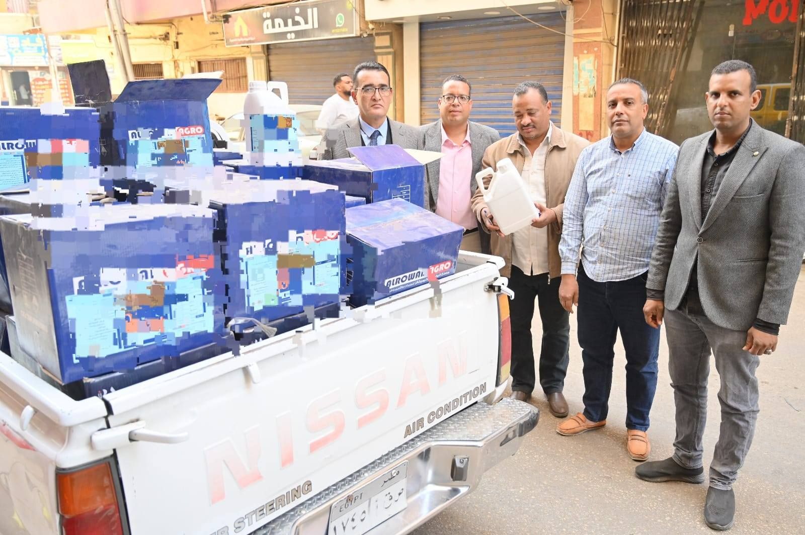 ضبط كميات من المخصبات الزراعية والمبيدات الحشرية مجهولة المصدركما أسفرت حملة أخرى بمدينة الأقصر عن ضبط كميات كبيرة من المخصبات الزراعية والمبيدات الحشرية مجهولة المصدر، بمشاركة مفتشي المديرية: أحمد محمود ربيع مدير الرقابة، ومحمد عثمان أحمد كبير مفتشي المديرية، وأيمن رمضان عوض الله مدير إدارة تموين بندر الأقصر، حيث تم ضبط 40 كرتونة مخصب زراعي (رواميروز 13%) بكل كرتونة 12 كيس وزن الكيس 1 كجم دون فواتير، و60 جركن مخصب زراعي وزن الجركن 1 كجم بدون مستندات، و11 كرتونة مبيدات حشرية بكل كرتونة 20 عبوة وزن العبوة 200 مل، جميعها دون فواتير أو مستندات دالة على المصدر.