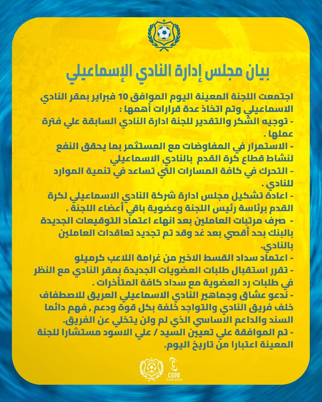 وفي ختام بيانها، دعت اللجنة جماهير الإسماعيلي إلى مواصلة دعم الفريق والاصطفاف خلفه خلال المرحلة المقبلة، مؤكدة أن الجماهير تمثل السند والداعم الأساسي للنادي، كما أعلنت الموافقة على تعيين علي الأسود مستشارًا للجنة المعينة اعتبارًا من اليوم.