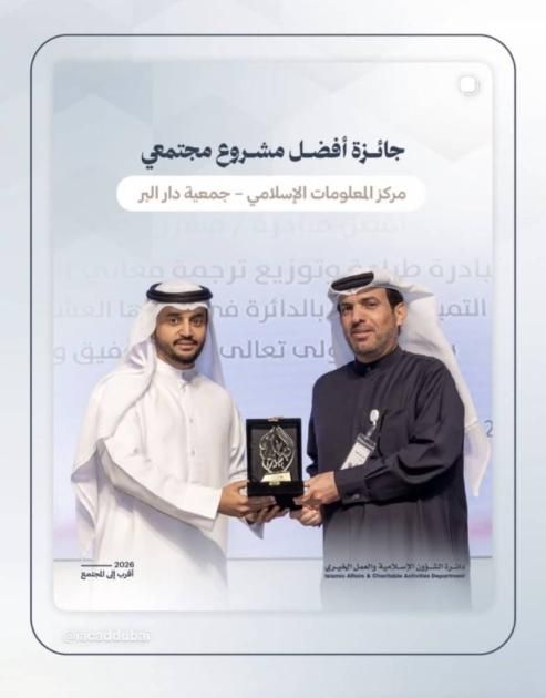 حقق مركز المعلومات الإسلامي التابع لجمعية دار البر إنجازا جديدا بفوزه بالمركز الأول ضمن فئة أفضل مبادرة ومشروع مجتمعي، وذلك في جائزة التميز الداخلي بدائرة الشؤون الإسلامية والعمل الخيري بدبي في الدورة العشرين، تأكيدا لتميزه وريادته في خدمة المجتمع وتعزيز أثره الإيجابي.