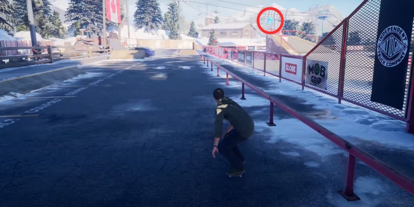 انظري إلى صورة Red Bull داخل حديقة التزلج، ثم ركزي على الشجرتين الظاهرتين في هذا الموضع، حيث تظهر أيقونة المال معلّقة بينهما. استخدمي الشجرة القابلة للميل للطحن عليها صعودًا، مما يتيح الوصول إلى المال المعلّق في الأعلى دون الحاجة إلى قفز إضافي.