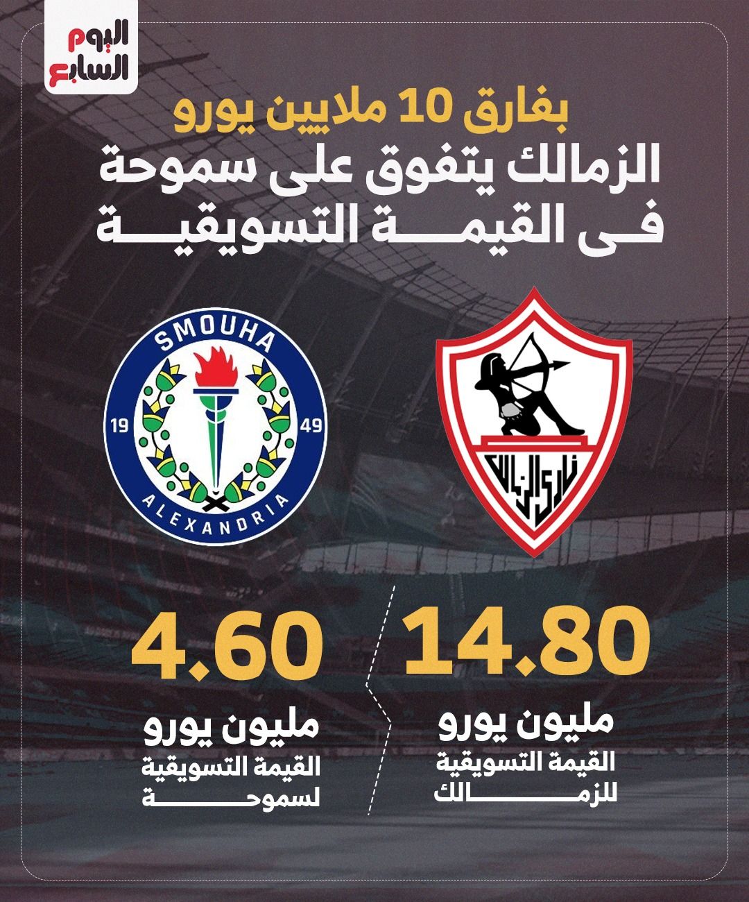 يتفوق فريق الزمالك على فريق سموحة في القيمة التسويقية، حيث تبلغ قيمة الزمالك التسويقية 14.80 مليون يورو، بينما تبلغ قيمة سموحة التسويقية 4.60 مليون يورو، أي أن قيمة الزمالك تساوى 10 أضعاف قيمة سموحة قبل لقاء اليوم.