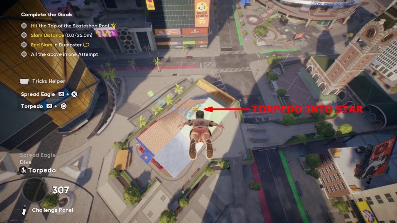 أثناء وجود المتزلج في الهواء، ينبغي الدخول فورا في وضعية Spread Eagle، ثم توجيه دائرة الاصطدام الزرقاء والصفراء بحيث تتمركز بدقة حول النجمة الموجودة أعلى سطح متجر التزلج. يعد تمركز دائرة الاصطدام في هذا الموضع خطوة حاسمة، لأنه يحدد زاوية الاصطدام وقوة الارتداد الناتجة عنه.