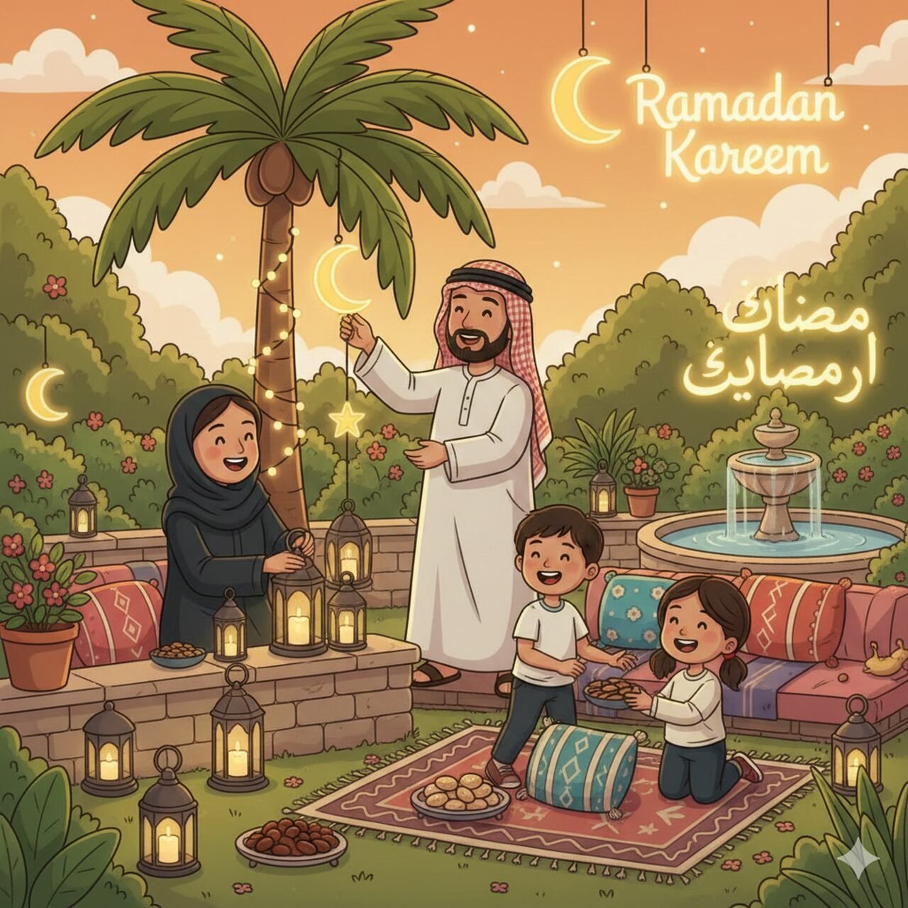 في ليلة الجمعة، قررت أم سليم أن تجعل العائلة كلها في حديقة المنزل لمشاهدة الفوانيس المضاءة، بينما كانت رائحة السمبوسة والحلويات تعبق في أرجاء البيت. جلس الأطفال على سجادة كبيرة، وكانت ريم وسليم جنباً إلى جنب، يحدقان في الفانوس الملوّن، بينما تلمع الشموع الصغيرة حولهم. فقالت الأم بابتسامة دافئة: "انظروا، كيف أن فانوسكم يضيء الغرفة كلها، وكل واحد منكم أضاف شيئاً فريداً فيه."