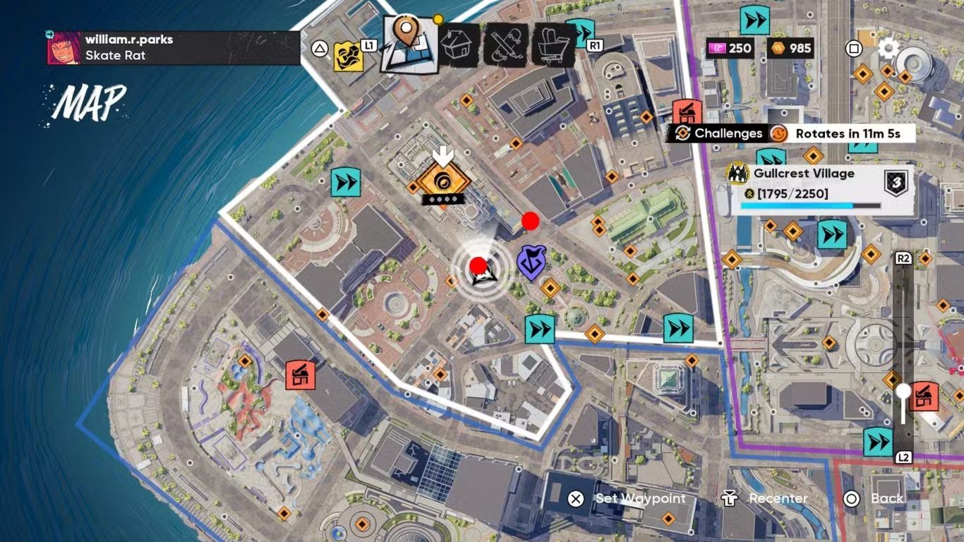 - بعد تجاوز السهم الأخير، اسحب العصا اليمنى إلى الأسفل ثم ادفعها إلى الأعلى وبزاوية مائلة نحو اليسار عند نهاية المنحدر لبدء Kickflip.