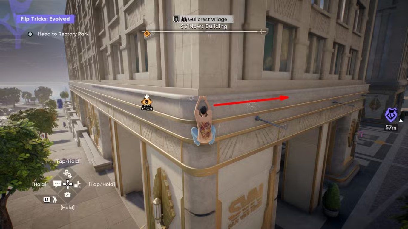 بعد الوصول إلى الحافة، ينبغي الضغط إلى اليسار أو اليمين على العصا اليسرى للتحرك جانبيا على طول الحافة، مع التوقف عند الوقوف أسفل إحدى النوافذ. عندها يجب دفع العصا اليسرى إلى الأعلى مرة أخرى مع الضغط المتكرر على زر التسلق للصعود إلى الجدار التالي. عند الوصول إلى الأعلى، سيواجه اللاعب جدارا إضافيا، ويتم تسلقه بالطريقة نفسها عبر دفع العصا اليسرى إلى الأعلى مع الضغط على زر التسلق. توجد نقطة الانتقال السريع والتحديات الخاصة بمبنى SV News فوق هذا السطح.