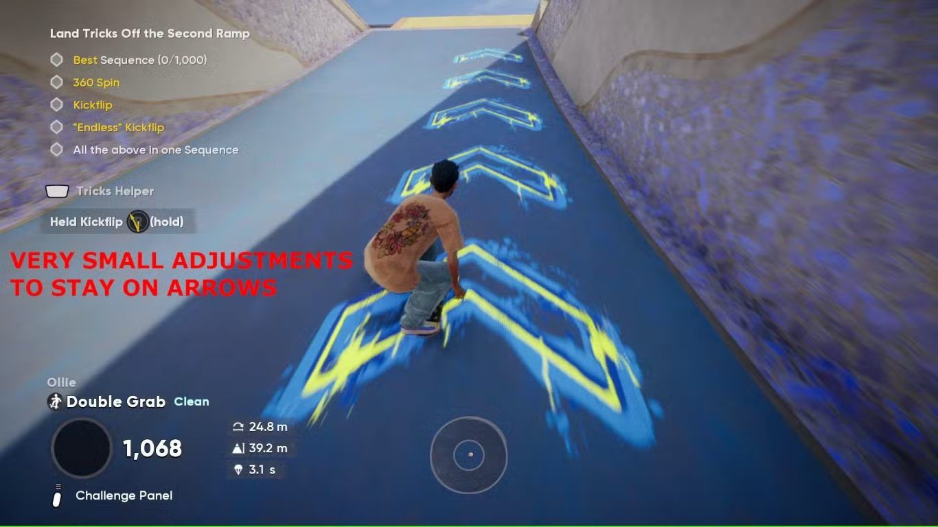 إذا كان اللاعب يلاحظ أنه يهبط قبل نقطة الهبوط المطلوبة، فيجب تقليل شدة حركة العصا اليسرى أثناء السير فوق المنحدر الأزرق. يؤدي الضغط القوي على العصا اليسرى إلى فقدان قدر كبير من الزخم، لذلك ينبغي استخدام لمسات خفيفة للغاية. كما يجب التأكد من تنفيذ Double Grab أثناء السقوط نحو المنحدر الأزرق، وبدء Kickflip في اللحظة الأخيرة الممكنة لزيادة المسافة.