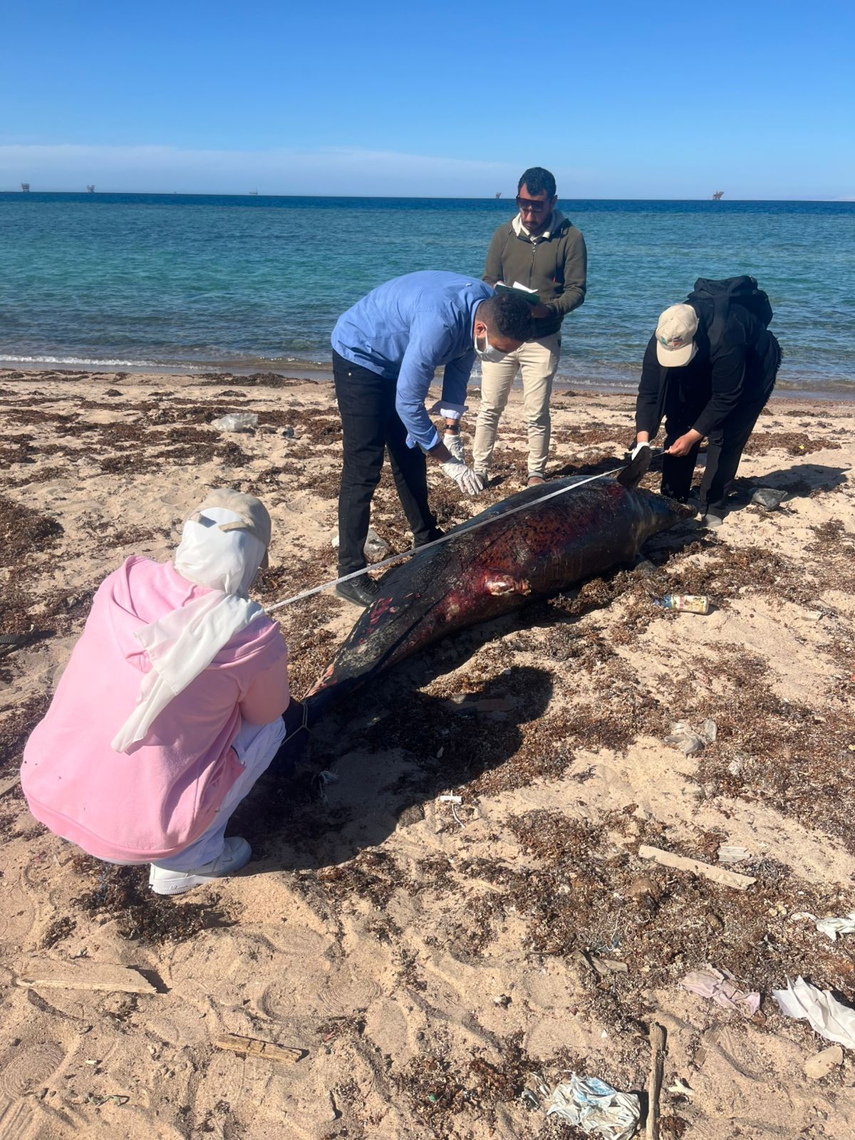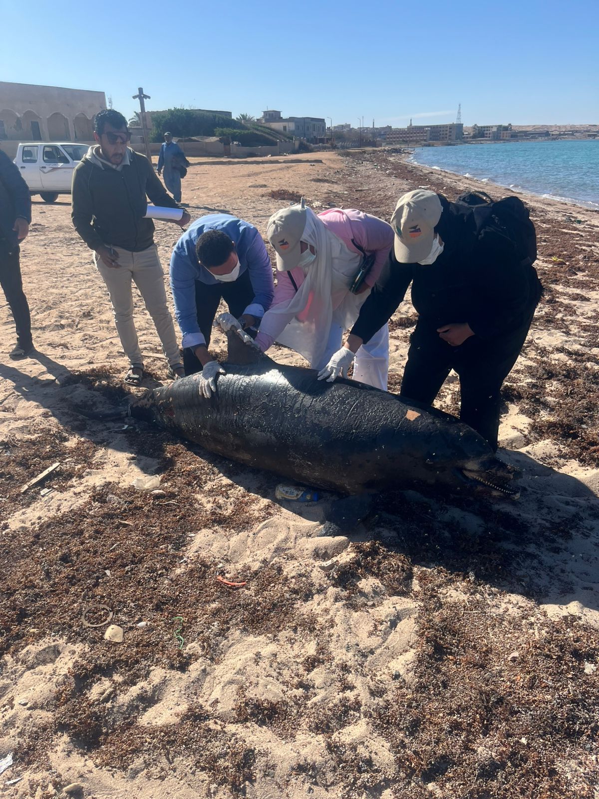 وأوضحت الدكتورة منال عوض أنه قد ورد بلاغ إلى محميات البحر الأحمر بوزارة التنمية المحلية والبيئة يفيد بوجود دولفين نافق بمنطقة الموظفين خلف نادي الصيد بمدينة رأس غارب، وعلى الفور تم تشكيل فريق عمل من باحثي ومراقبي محميات البحر الأحمر للانتقال إلى الموقع لمعاينة الحالة وفحص الوضع العام للكائن البحري والوقوف علي أسباب النفوق واتخاذ كافة الإجراءات البيئية في هذا الشأن.