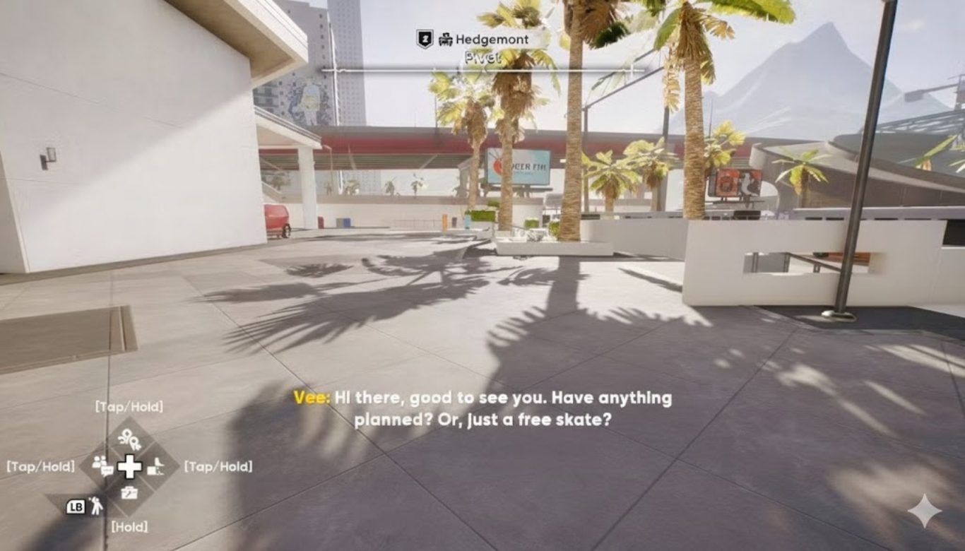 كما ذُكر سابقًا، تُعد Vee رفيقتك الذكية (AI) في Skate 4. تنضم إليك منذ البداية، حيث ترشدك خلال خطوات التدريب الست في جزيرة البداية، وتشرح لك كيفية تنفيذ الحركات في San Van. تقوم بتوضيح أهداف التحديات، وتساعدك في فهم القوائم، وتجعل آليات اللعب أسهل للاستيعاب. كما تقدم تذكيرات أثناء المهام، لكن تكرار نفس العبارات قد يصبح مرهقًا مع الوقت. بالنسبة لبعض اللاعبين، قد تبدو بعض حواراتها متكلفة قليلًا أو مبالغًا في استخدامها.