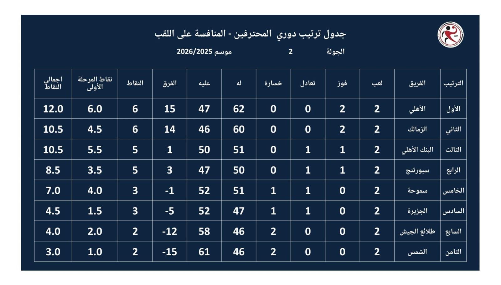 السبت، 14 فبراير 2026 05:30 مأعلنت لجنة المسابقات باتحاد كرة اليد جدول ترتيب دوري المحترفين للكبار للموسم المحلي 2025-2026 للمنافسة على اللقب عقب انتهاء الجولة الثانية من المرحلة الثانية.