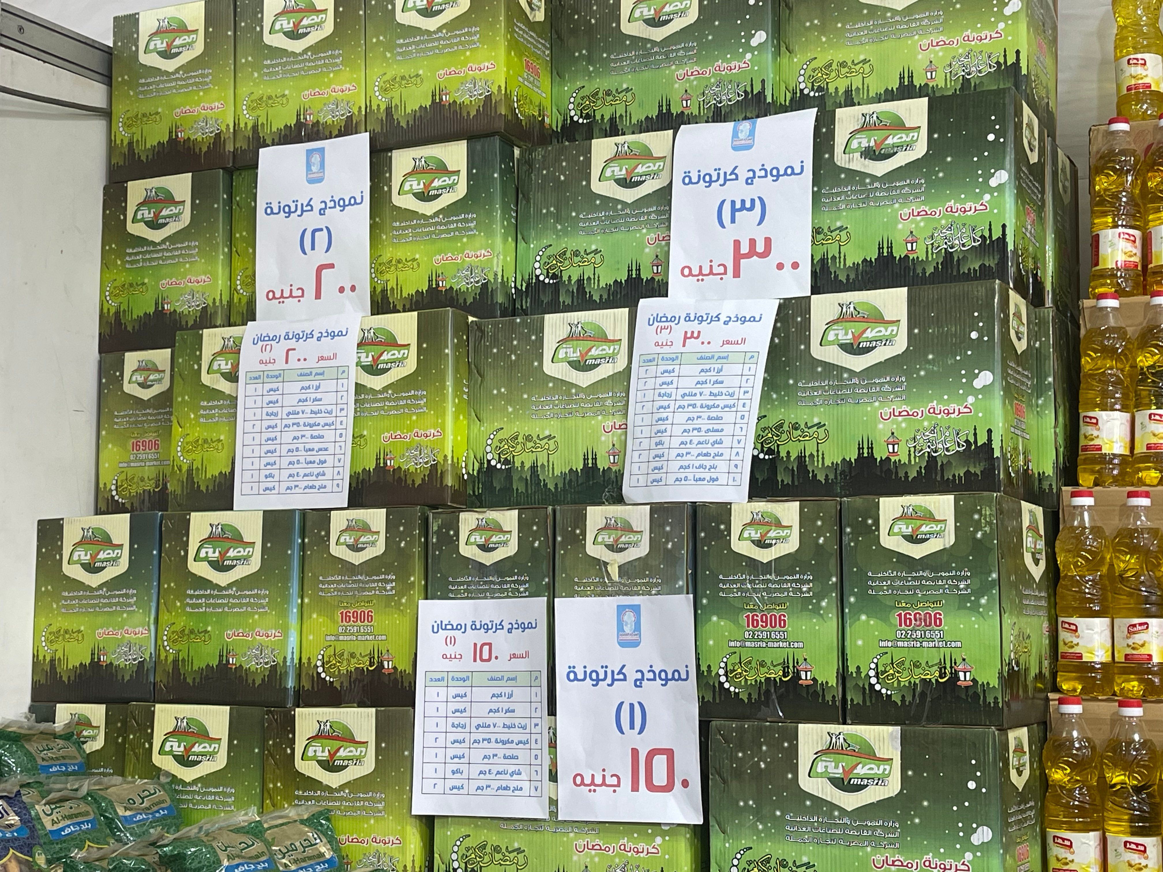 3- كرتونة بسعر 300 جنيه تضم 10 أصناف "2 كيلو سكر – 2 كيلو أرز – صلصة 300 جرام – 2 مكرونة أنواع 350 جرام – زيت 700 ملي – 2 شاي 40 جرام – 2 ملح 300 جرام – كيلو بلح – فول 500 جرام – سمنة 350 جرام ".