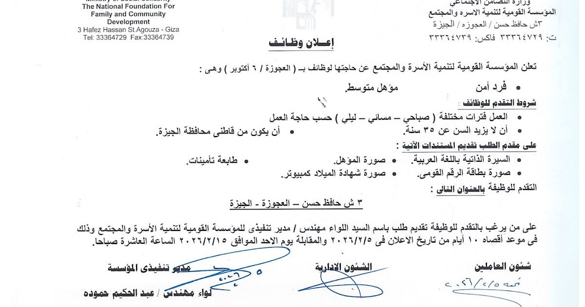 ش حافظ حسن - العجوزة - الجيزة على من يرغب بالتقدم للوظيفة تقديم طلب باسم السيد اللواء مهندس / مدير تنفيذى للمؤسسة القومية لتنمية الأسرة والمجتمع وذلك في موعد أقصاه ١٠ أيام من تاريخ الاعلان فى ۲۰۲٦/٢/٥ والمقابلة يوم الاحد الموافق ۲۰۲٦/٢/١٥ الساعة العاشرة صباحا