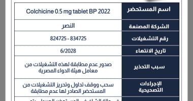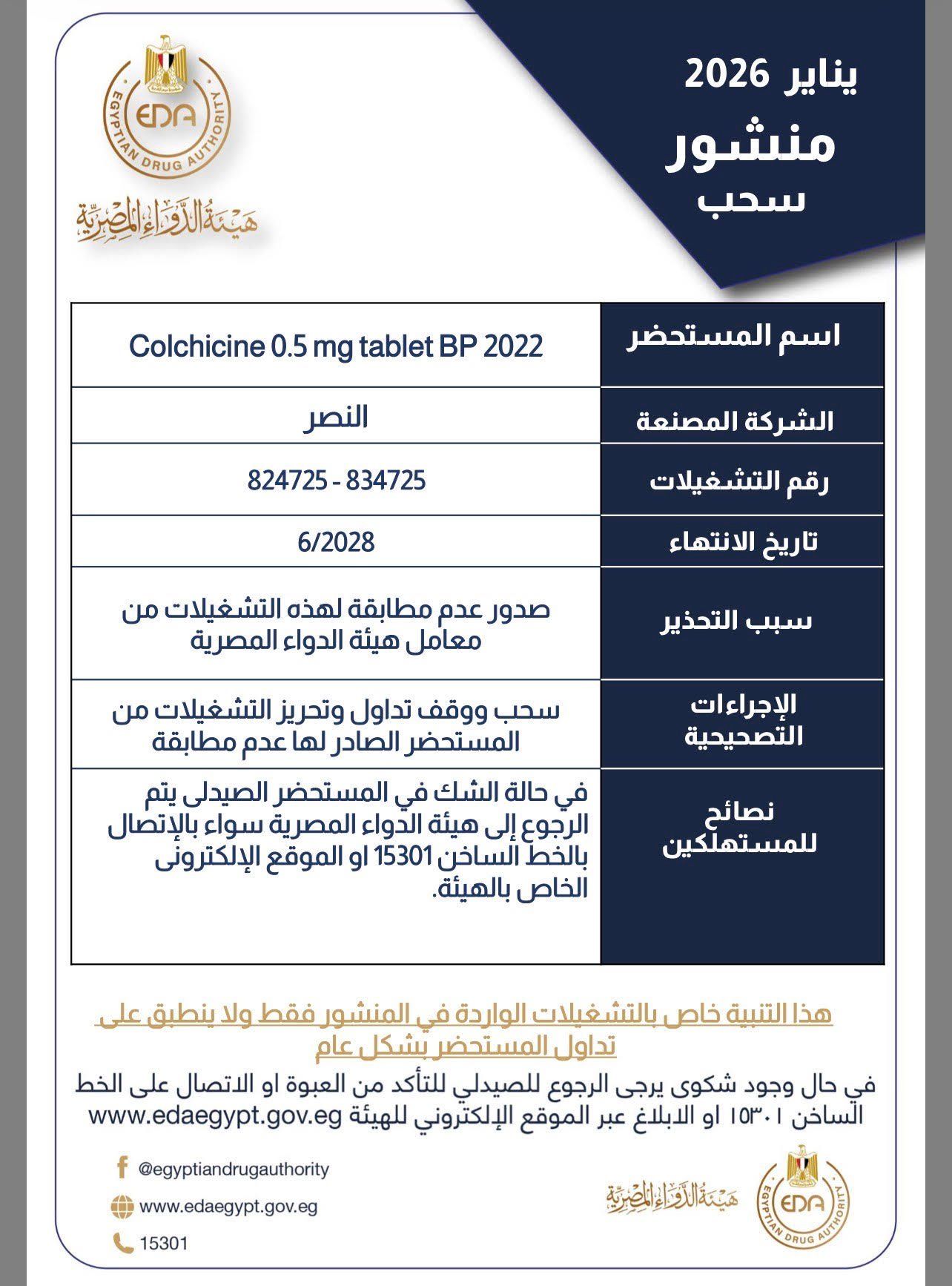 الأحد، 15 فبراير 2026 04:11 مأعلنت هيئة الدواء المصرية عن إصدار منشور تحذيري بسحب ووقف تداول عدد من تشغيلات مستحضر أقراص كولشيسين 0.5 ملغ، وذلك بعد ثبوت عدم مطابقتها للمواصفات القياسية من خلال تحاليل معامل الهيئة.