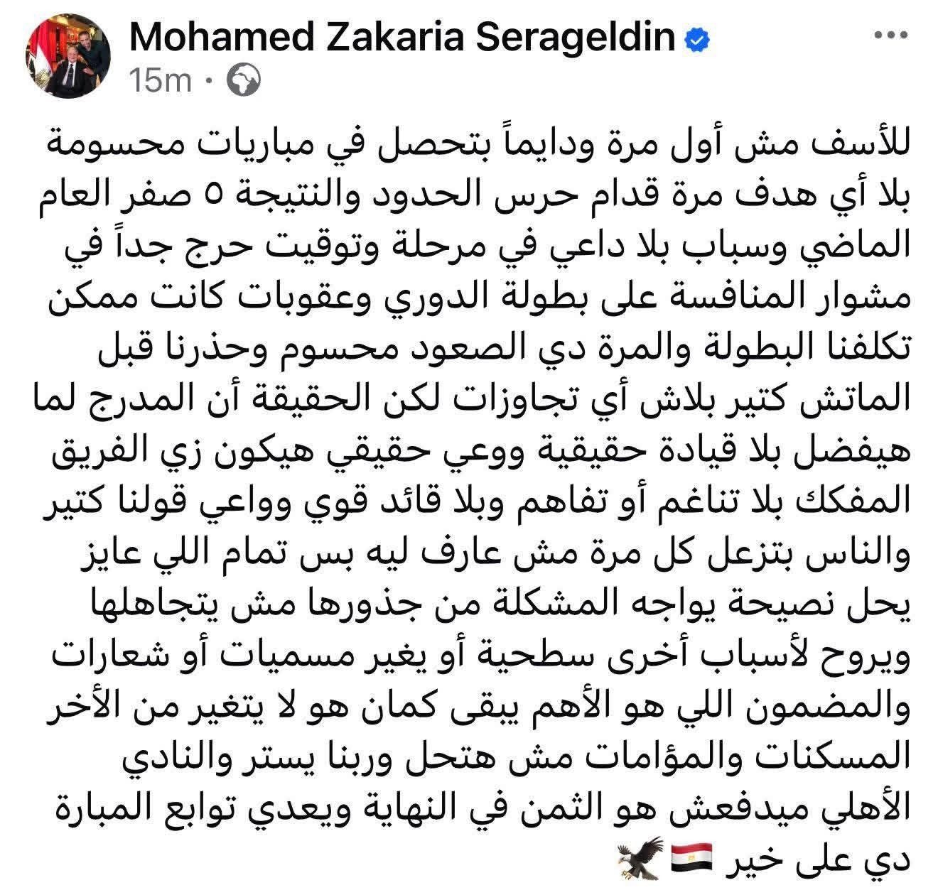 وقال سراج الدين عبر حسابه على فيسبوك: "للأسف مش أول مرة ودايماً بتحصل في مباريات محسومة بلا أي هدف مرة قدام حرس الحدود والنتيجة ٥ صفر العام الماضي وسباب بلا داعي في مرحلة وتوقيت حرج جداً في مشوار المنافسة على بطولة الدوري وعقوبات كانت ممكن تكلفنا البطولة".