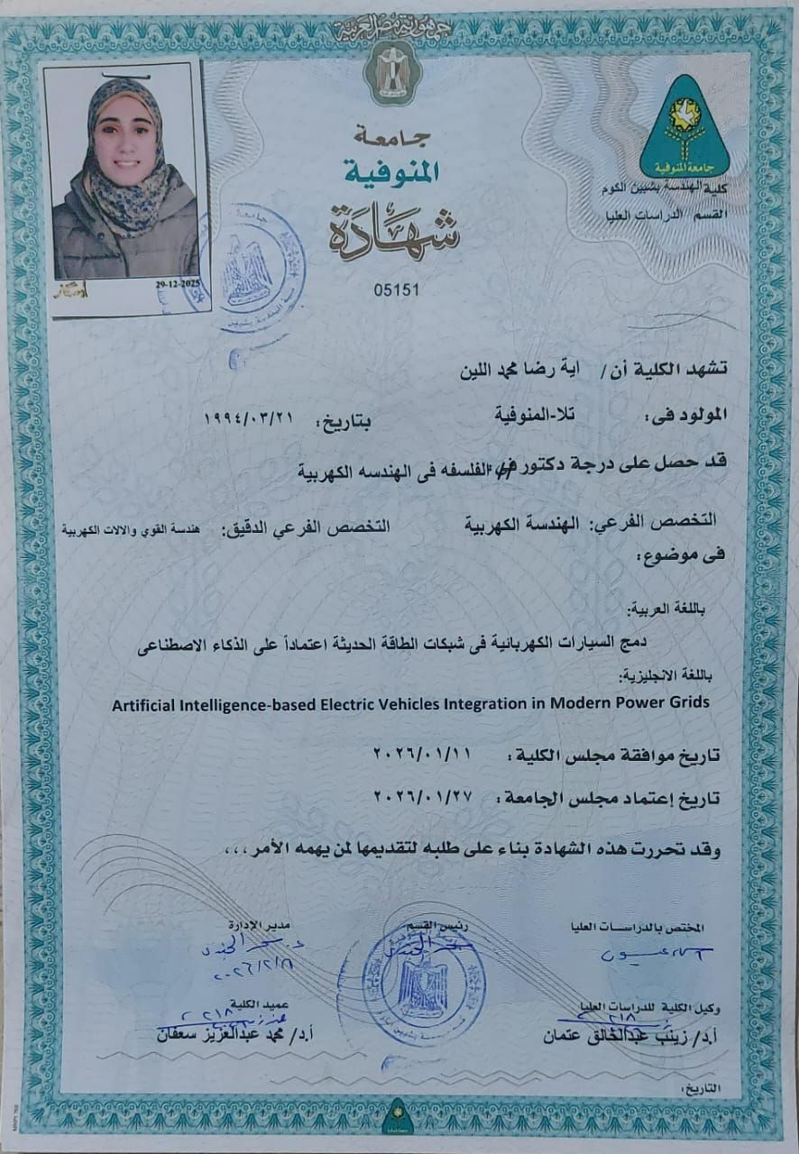 الإثنين، 16 فبراير 2026 10:57 صحصلت الدكتورة آية رضا اللين، علي الدكتوراه من جامعة المنوفية، في رسالة بعنوان " دمج السيارات الكهربائية في شبكات الطاقة الحديثة اعتمادا على الذكاء الاصطناعي"، بقسم الهندسة الكهربية بالجامعة.