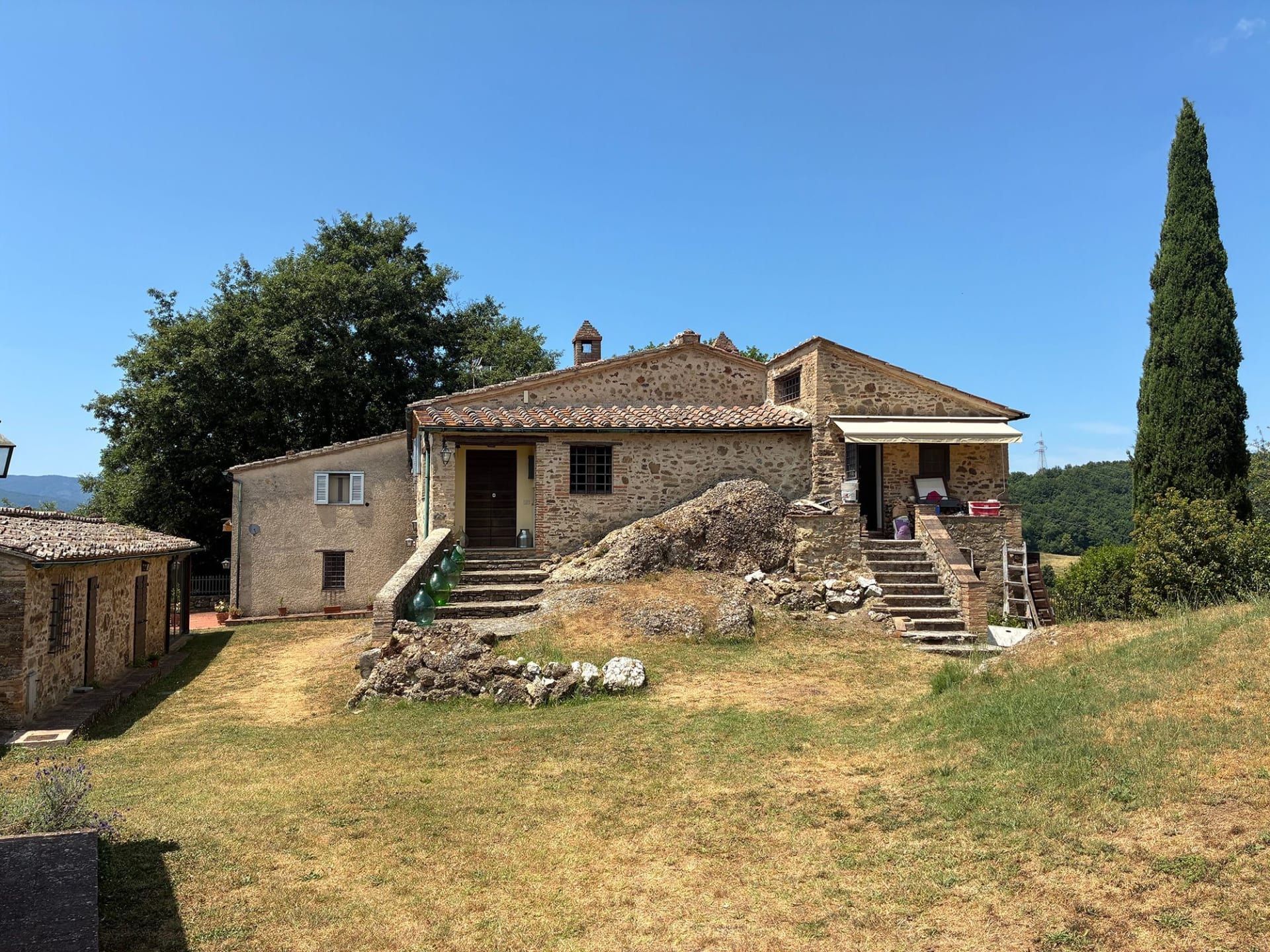يتميز المنزل الريفي الرئيسي بعوارض خشبية كبيرة، وسقف توسكاني، ومدفأة ضخمة، وأبواب خشبية، وألوان حجر توسكانا التقليدية.