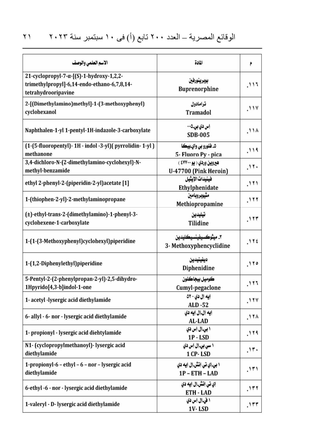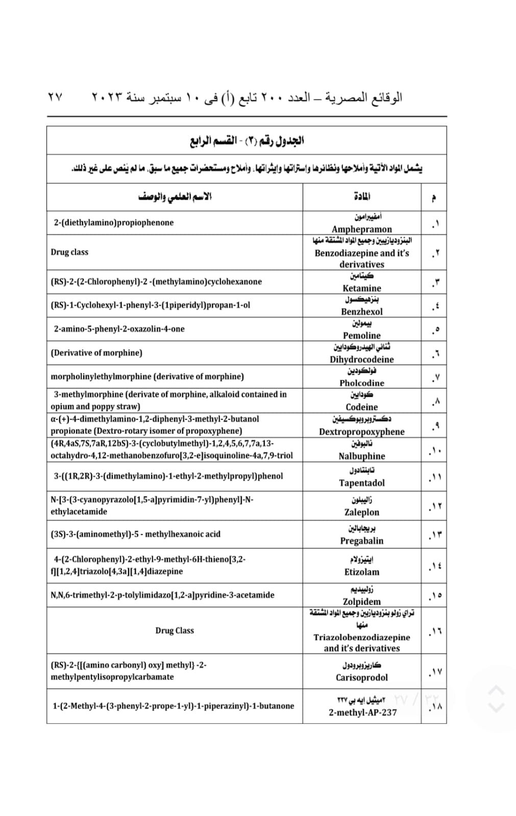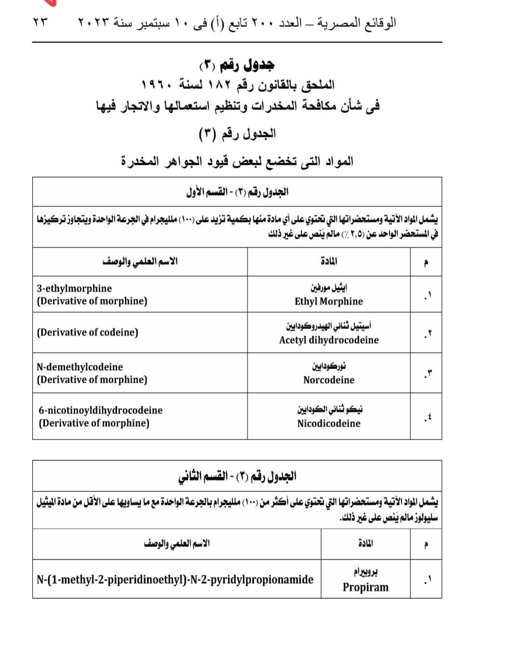 صدر من رئيس هيئة الدواء المصرية بعد توصيات اللجان المشكلة فى سبتمبر 2023 متضمنا إعادة تصنيف وتعديل جدول المخدرات، بما في ذلك إضافة مواد جديدة أو نقل مواد بين الأقسام المختلفة للجداول لضبط تداولها والذى ترتب عليه تجريم ومعاقبة من يضبط بحوزته هذه المواد المدرجة والتى من بينها المواد المخدرة المخلقة كالشابو والآيس.