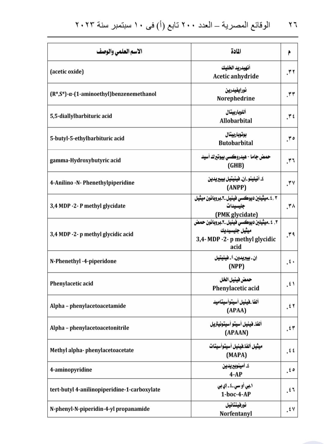 وعن الجداول التى تضمنها القرار فهى تشمل مواد وعناصر كيميائية تستخدم فى المعامل لتصنيع المواد المخدرة وهى كالتالي: