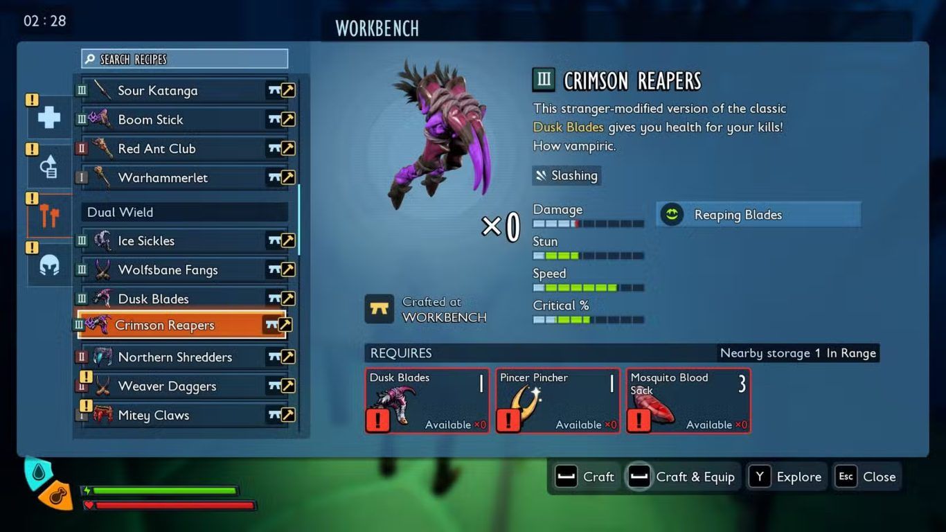 تمثل Crimson Reapers خيارا متخصصا للاعبين الذين يفضلون أسلوب القتال السريع المعتمد على التوازن بين الهجوم والبقاء ويمنحهم أداة فعالة للتعامل مع المواجهات القريبة ضمن بيئة لعبة Grounded 2.