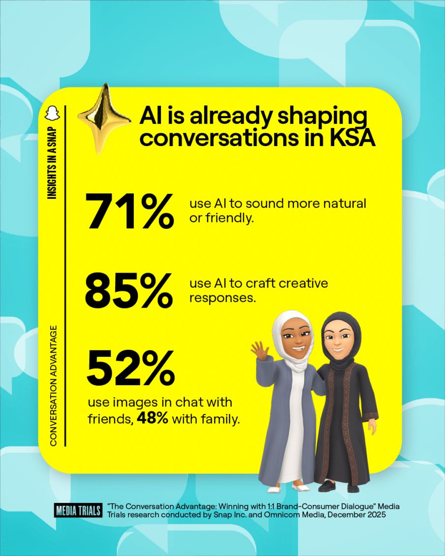 وبحسب النتائج، يرى أكثر من نصف مستخدمي وسائل التواصل الاجتماعي في المملكة أن مشاركة الصور أو مقاطع الفيديو داخل المحادثات الخاصة تُعد شكلًا من أشكال التواصل. كما أشار «معظم المستهلكين» إلى أن هذه الأشكال تساعدهم على التعبير عن مشاعرهم بوضوح أكبر، مع تزايد استخدام الذكاء الاصطناعي لإضافة لمسات إبداعية إلى الرسائل اليومية.