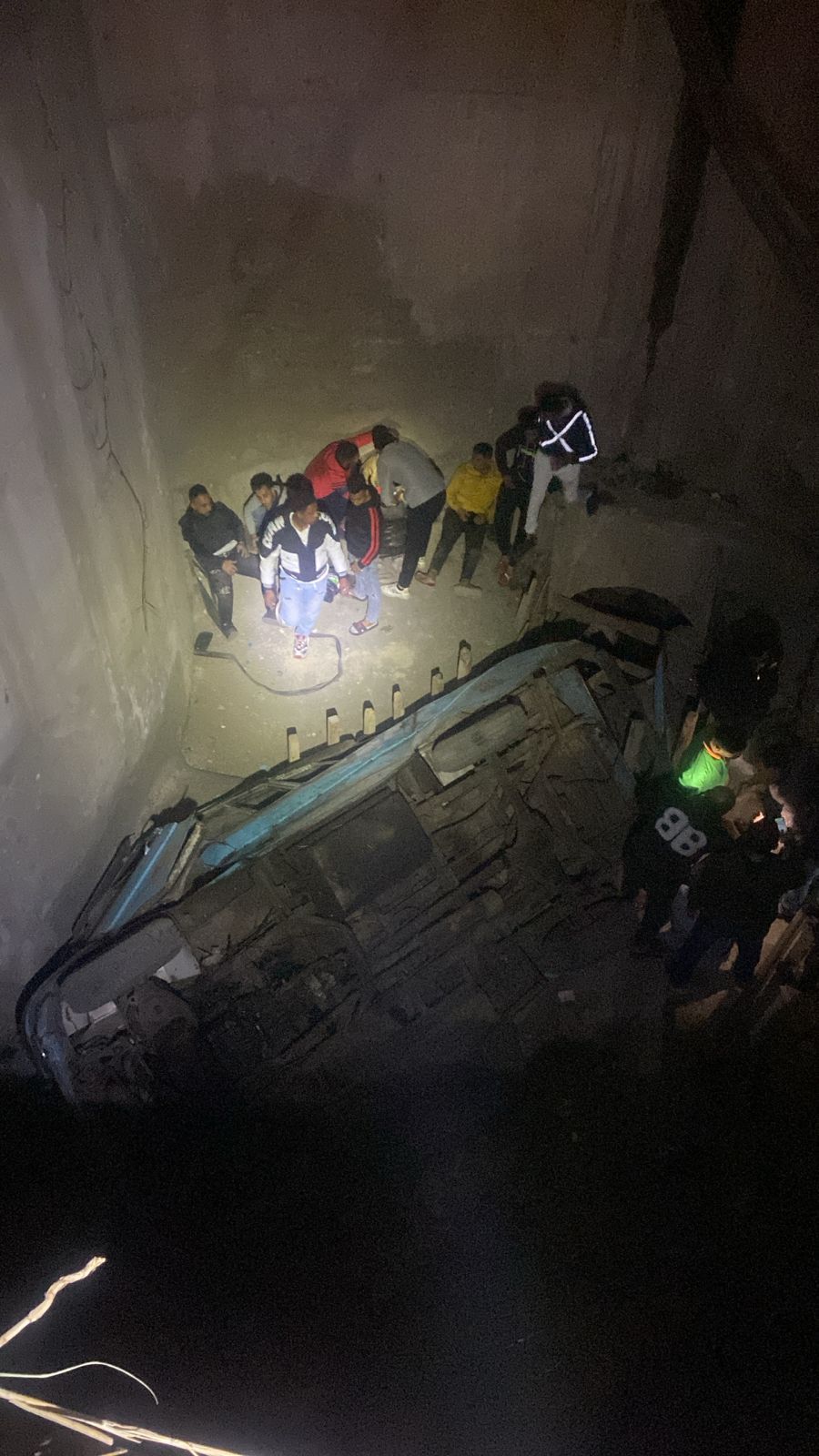 وبالإنتقال و الوصول، تبين إنقلاب سيارة ميكروباص (أجرة) داخل حفرة على عمق (6) متر تقريباً (نتيجة أعمال إنشائية)، وبالفحص تبين وجود عدد (٥) أشخاص محتجزين داخل الحفرة (خارج السيارة الميكروباص)، وجاري استخراجهم بمعرفة القوات ،وتم إتخاذ الإجراءات القانونية اللازمة تجاه الواقعة.