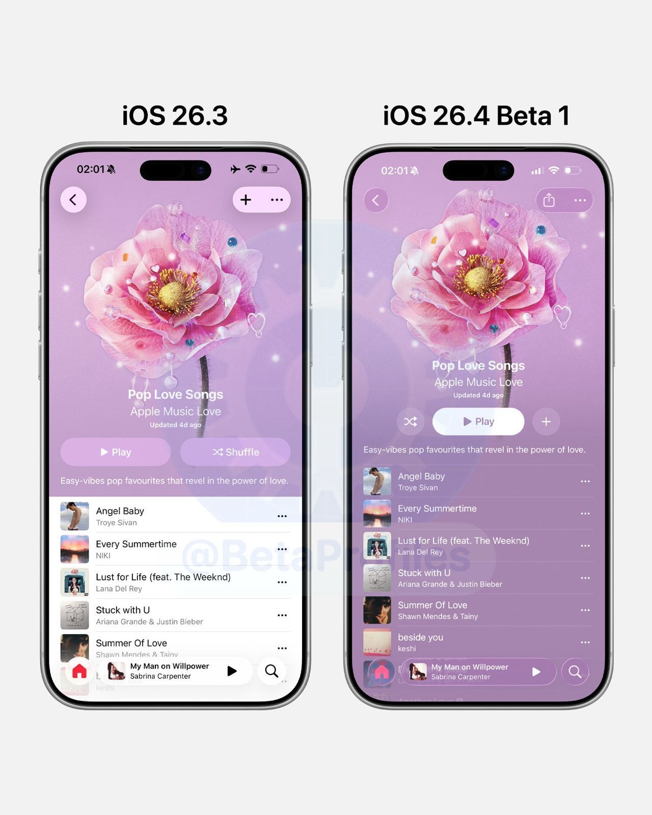 ويأتي التحديث الجديد بعد إصدار iOS 26.3، حيث تُظهر المقارنات بين الإصدارين تغييرات واضحة في تصميم الواجهة وطريقة عرض المحتوى داخل التطبيق، خاصة في صفحات الألبومات وقوائم التشغيل.