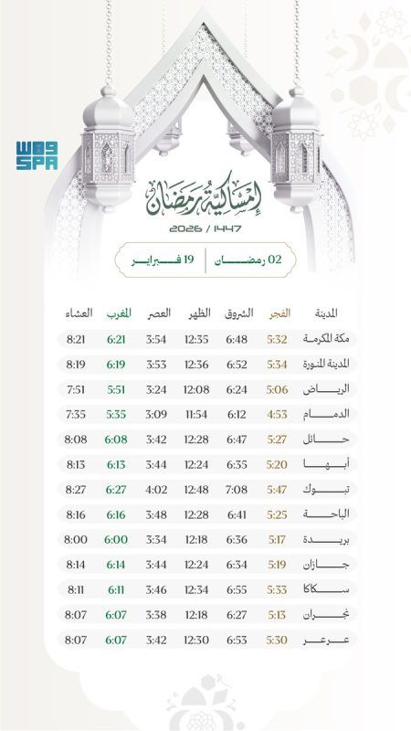 وفيما يلي إمساكية يوم الخميس 2 رمضان 1447هـ، الموافق 19 فبراير 2026م.
