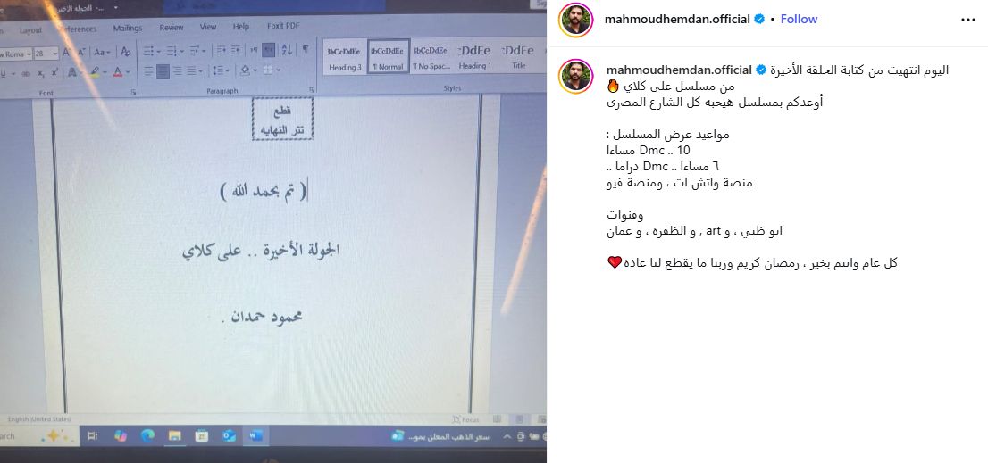 وقال حمدان، عبر حسابه على انستجرام: "اليوم انتهيت من كتابة الحلقة الأخيرة من مسلسل على كلاي، أوعدكم بمسلسل هيحبه كل الشارع المصري.. كل عام وانتم بخير ورمضان كريم وربنا ما يقطع لنا عادة".