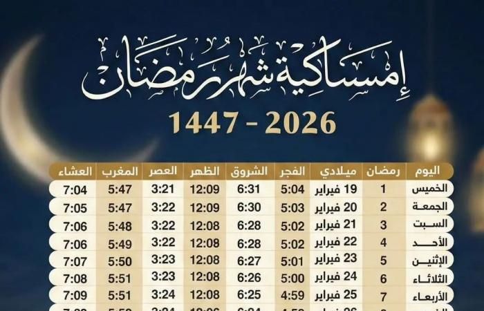 وأعلنت الإمساكية الفلكية المعتمدة أن موعد أذان الفجر اليوم الخميس 19 فبراير 2026 في القاهرة هو الساعة 5:04 صباحًا، ليبدأ المسلمون أول أيام الصيام فور رفع الأذان.