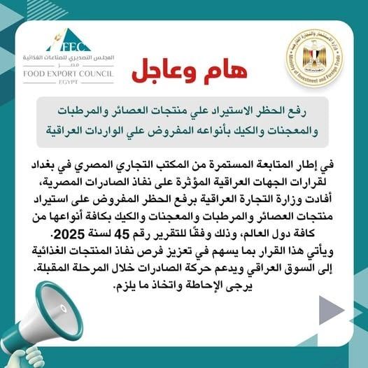 وتوقع المجلس أن يسهم رفع الحظر في تنشيط حركة الصادرات الغذائية المصرية إلى العراق خلال الفترة المقبلة، خاصة في ظل ما تتمتع به المنتجات المصرية من قدرة تنافسية وانتشار سابق في السوق العراقي، وهو ما قد ينعكس إيجابًا على حجم التبادل التجاري بين البلدين.