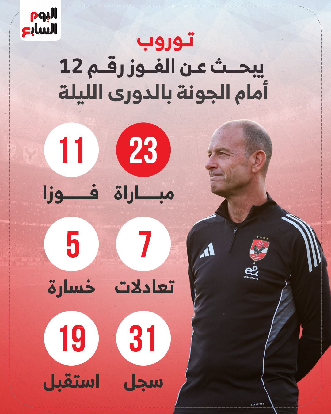 وتعد هذه المباراة رقم 24 للدنماركي ييس توروب المدير الفني للنادي الأهلي، منذ توليه القيادة الفنية للفريق، في أكتوبر من العام الماضي 2025، وخلال 23 مباراة سابقة، خاضها الفريق الأول لكرة القدم بالنادي الأهلي تحت قيادة توروب، نجح الأهلى فى تحقيق الفوز في 11 مباراة، وتلقى الهزيمة فى 5 لقاءات، وحضر التعادل فى 7 مباريات.وسجل لاعبو النادي الأهلي، تحت قيادة توروب، 31 هدفا، فيما تلقت شباك الأحمر 19 هدفا.وعلى الصعيد الأفريقي قاد صاحب الـ55 عاما النادي الأهلي فى 8 مباريات بالمسابقة، حتى الآن، تمكن خلالها من الفوز فى 4 لقاءات وحسم التعادل 4 مباريات.