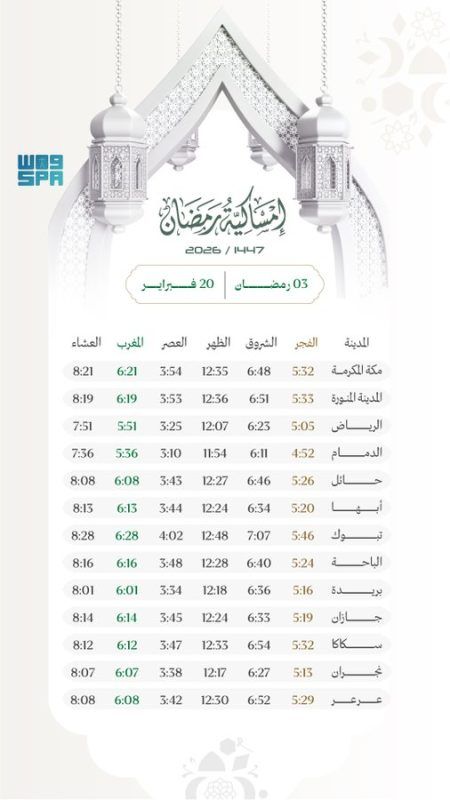 وفيما يلي إمساكية يوم الجمعة 3 رمضان 1447هـ، الموافق 20 فبراير 2026م.