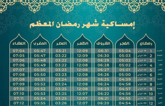 شهر رمضان هذا العام يبدأ يوم الخميس 19 فبراير 2026، ومن المتوقع أن يمتد حتى يوم الجمعة 19 مارس 2026. تختلف مواعيد الصلاة يوميًا بمعدل دقائق قليلة، لذا من المهم متابعة الإمساكية اليومية لضبط مواعيد الصلاة والإفطار بدقة.