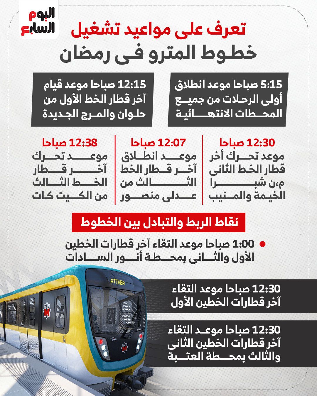 الخط الثاني: قيام آخر قطار من محطتي "شبرا الخيمة" و"المنيب" في تمام الساعة 12:30 صباحاً.