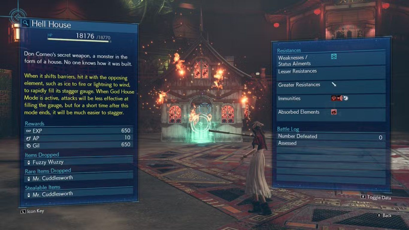 يجب تجهيز Cloud و Aerith بتعاويذ الرياح والنار والجليد والبرق لاستخدامها بالتناوب بحسب الحالة العنصرية النشطة لدى Hell House لأن اختيار العنصر الصحيح في التوقيت المناسب يعد العامل الأهم لإلحاق ضرر فعال خلال القتال.