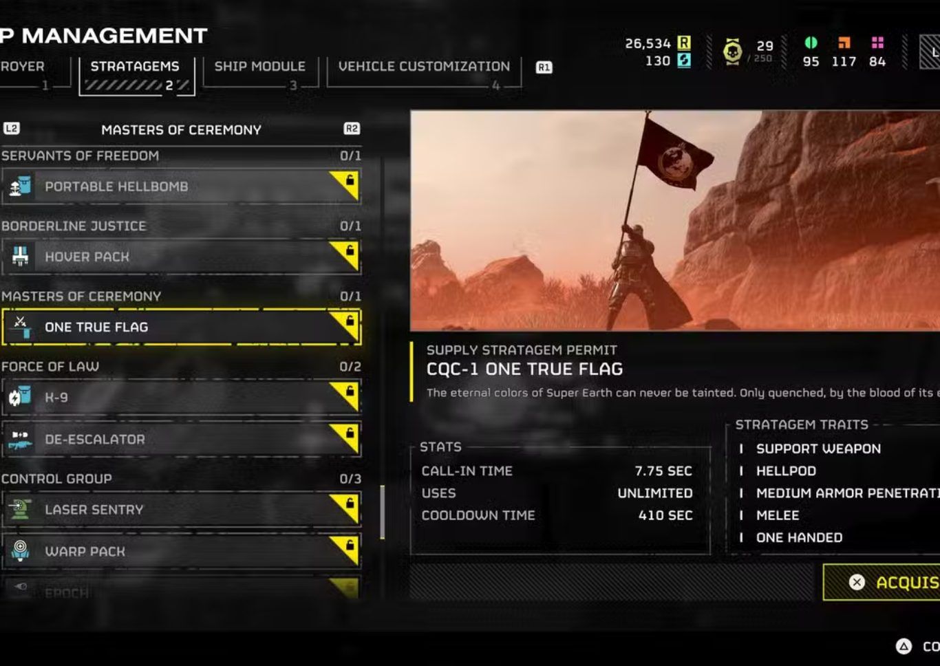 تتطلب حزمة Masters of Ceremony Warbond إنفاق 1000 Super Credits لفتحها وبعد فتحها يصبح One True Flag متاحا للشراء من الصفحة 3 مقابل 110 Medals قبل إضافته إلى قائمة Strategems داخل قسم Ship Management.