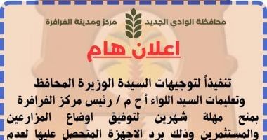 وكانت حنان مجدي محافظ الوادي الجديد، أعلنت عن إعادة توصيل التيار الكهربائي للأراضي الزراعية التي سبق فصل الخدمة عنها؛ لتقاعس أصحابها عن سداد المديونيات المستحقة، ومنح مهلة لمدة شهرين من تاريخه لتوفيق الأوضاع بالتنسيق الكامل مع رؤساء المراكز المعنية.